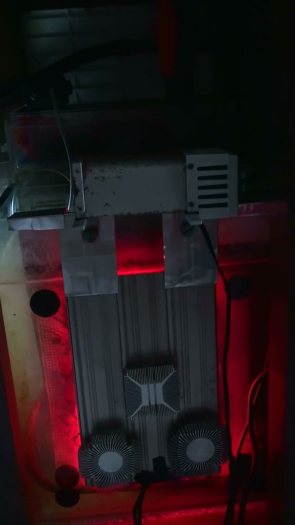 這是掛在底缸的情形,LED為了散熱,全裝在鋁片上,以前電腦壞了換下來的散熱器,全部沒丟,現在全部派上用場,加上CPU散熱膏,全部黏上去;上面再裝個簡易的橫流扇幫助散熱。