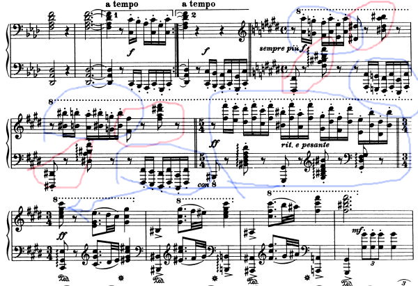 這邊藍色圈起來可以看見,音跳躍的距離一次比一次遠,而且高音部低音部交替反覆,最後一次,除了音量加大外,音的距離拉得更開,加上漸慢,最後到ff 的合聲,這就是明顯製造音樂張力的地方。紅圈起來的部分是這樂句支撐的地方,音色和音質彈的不連續,氣勢也會不見了。