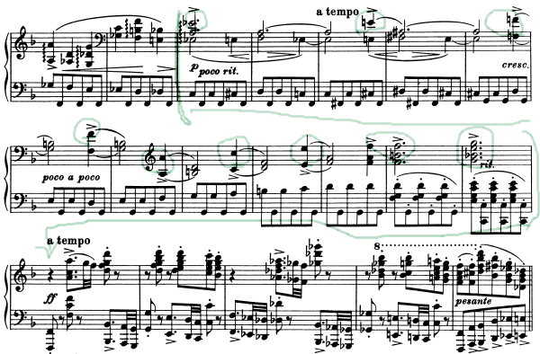這是再現部要進入尾奏之前一段醞釀氣氛的段落,從一開始的霧茫茫,不清楚,到撥雲見日,漸漸嶄露,一直到光明出現。可以看到左手部分伴奏音形的音域是越來越大的,從單音到最後用和弦。而右手高音部用綠色圈起來的部分,則是用大小->大小->大小(上去回來)… 但卻是音一次比一次高,最後光明的進入尾奏的部分,這也是音樂製造張力的手法。