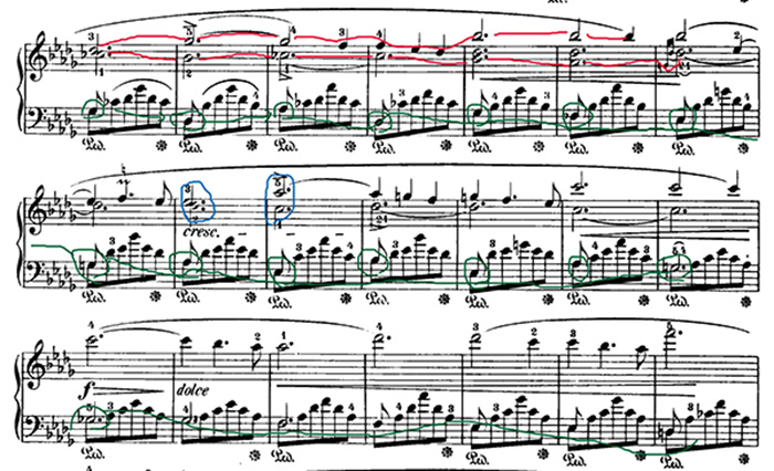 同樣的道理,左手伴奏的部分,也是有旋律線(綠線)的存在,像這樣程度的曲子,沒考慮隱藏的旋律,就只是當成一般伴奏來彈的話,聽起來就沒感覺了。而右手看起來簡單,也是要考慮聲部橫向的行進(紅線),並非不要考慮縱向的合聲效果(藍線),若是單純的把它當和聲去彈,樂句的趣味會少很多,往往會聽起來音樂是切斷的,一塊塊的,甚至於出現分句怪異的情形。所以類似這樣的情形出現,老師都會要求分聲部,彈熟,再合起來,即便好幾個聲部都是用同一隻手彈,也要頭腦清晰。(所以巴哈的多聲部曲子,甚至賦格曲都是用來打基礎的曲目)