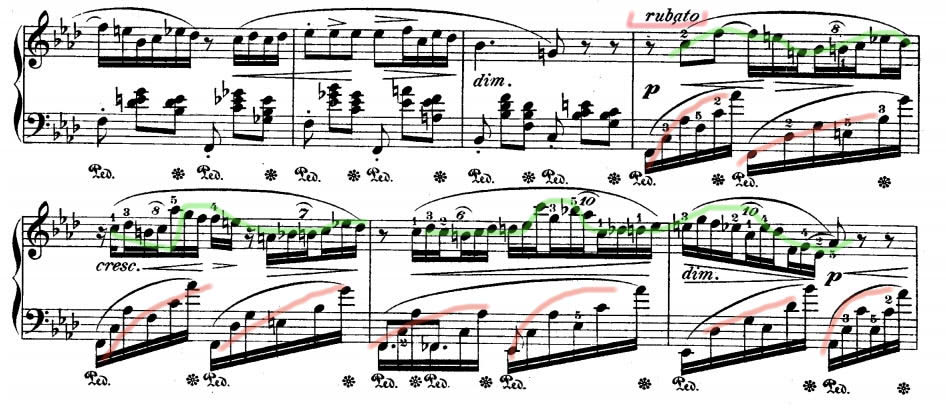 這邊就是行雲流水一般,譜上標示 rubato 彈性速度(原典版沒有)。這邊如果要完全照譜上拍子彈,整個就是怪異,而且如果要照4-3,3-2,5-3,7-3….等等的節奏去算來對拍子的話,一來很不好彈,二來彈了也不好聽。總之,綠色線的主旋律練熟,加上想要的速度變化,然後左手彈熟,在適當的位置加進去就行了。由於左手音符跨度大,當初慢練時為了音不跑掉每個音都彈深(其實不管練快練慢都應該如此),但合手時,卻將左手聲部彈得太大聲了,犯了這樣簡單的大忌,紀錄一下順便警誡自己。後面幾頁差不多都是同樣的注意事項。