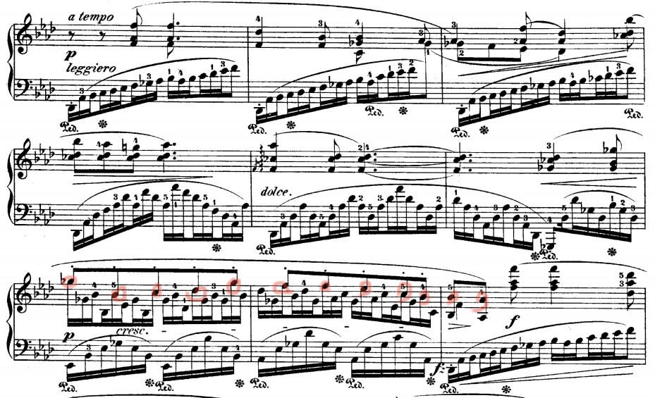 這邊是一個要注意指法的部分(要找自己適合的,每個人不同),不然無法彈快,或是該有的分句重音彈不出力量。在下選擇的指法是原典版的,而非譜上的,這邊譜子上的指法開始是比較好彈,但彈起來總覺得氣勢力量不足,後來就改用原典版的指法,剛開始會比較不順手,一順手後,反而整體而言感覺比較滿意。