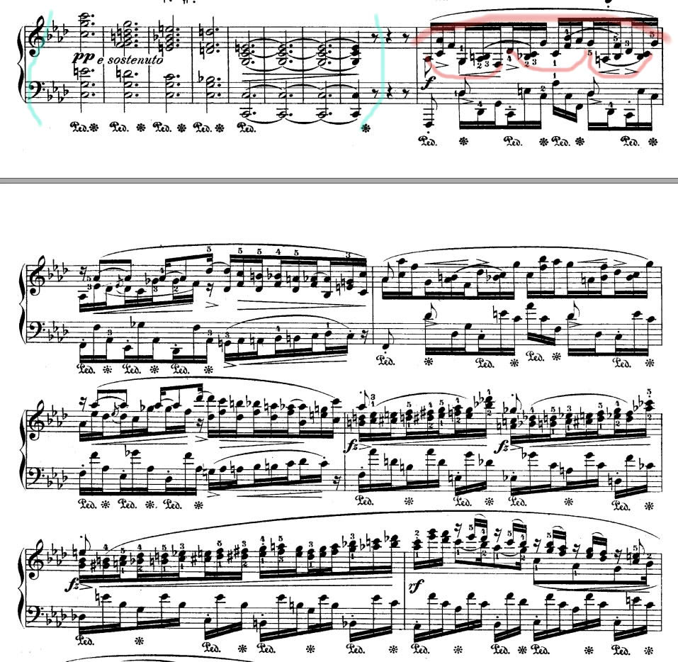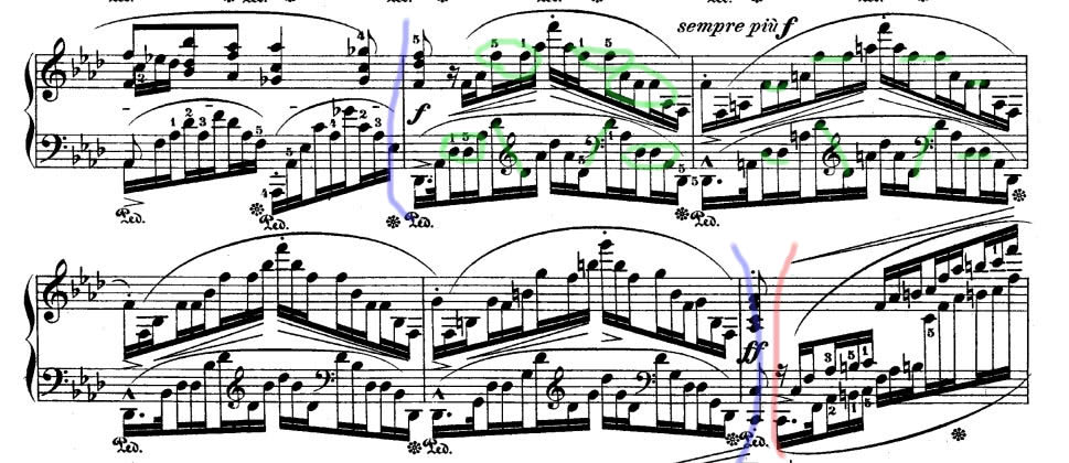 從前面到這邊藍色括號這四小節的部分,練過蕭邦練習曲應該都知道,這是著名的Op.25 No.12 外號叫做海洋的那首練習曲同樣的音形。只是拍子不同而已,綠色的部分就是用1指-5指, 5指-1指來彈同一個音,簡單說就是整人,不過利用老師說的Rotation 加上慢練後,也是越來越熟練了。
