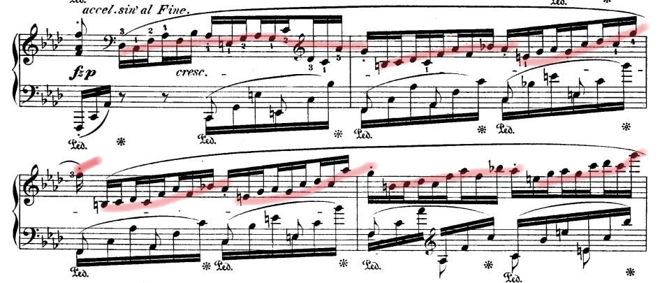 再來直到最後,狂暴,激動,像旋風般的。單論技巧而言,應該是整首最難的部分。這邊主要要注意分句(如紅線所示),再將小分句結合成大分句,不要一味往前彈。