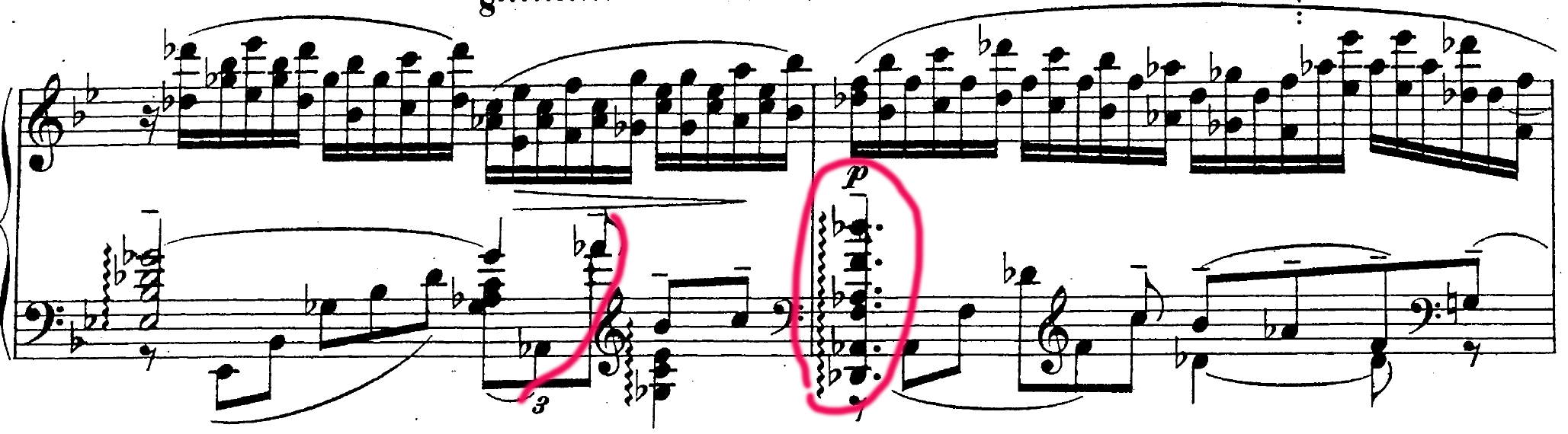 上圖譜例(中間其中兩小節,就只有兩小節那麼多音符): 中間這段旋律移到中聲部,左手同時負責中聲部旋律和低音部伴奏,用聽得會覺得比前面簡單多了,實際練起來剛好相反,右手的伴奏部分,其實又有隱含聲部在裏頭(八度音的部分),可以看成是雙聲部的跑動。左手的音(紅圈起來的,懶得數有幾個了),跨度大,又是主旋律的部分,相當不好處理。