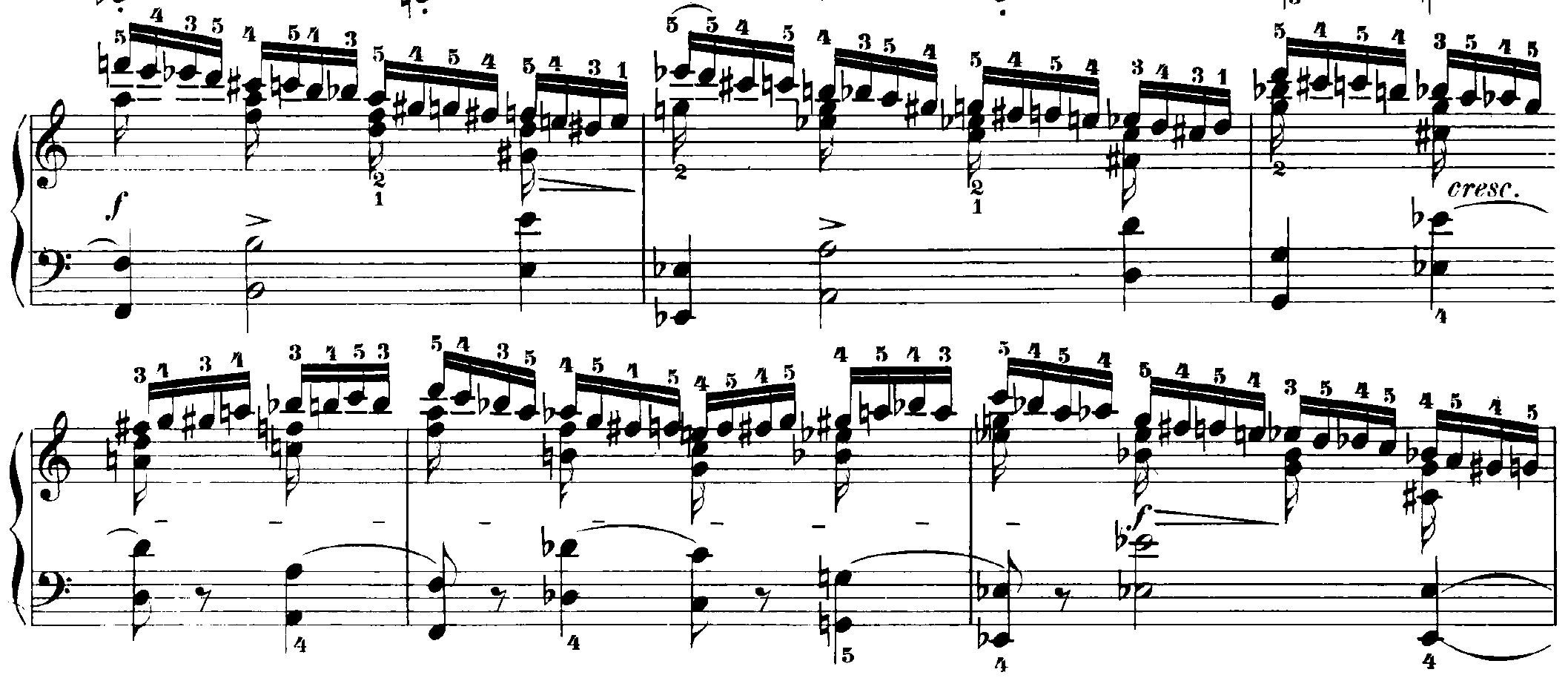 速度一個四分音符144,好像還好,跟第一首Op10-1(四分音符176)和Op.10-4(二分音符88=四分音符176)比起來,真的不算快。而且和聲與聲部線似乎也沒甚麼複雜的地方。只要實際用自己的手,在鋼琴上實際操作,就會知道其實這首,真的沒想像中簡單。